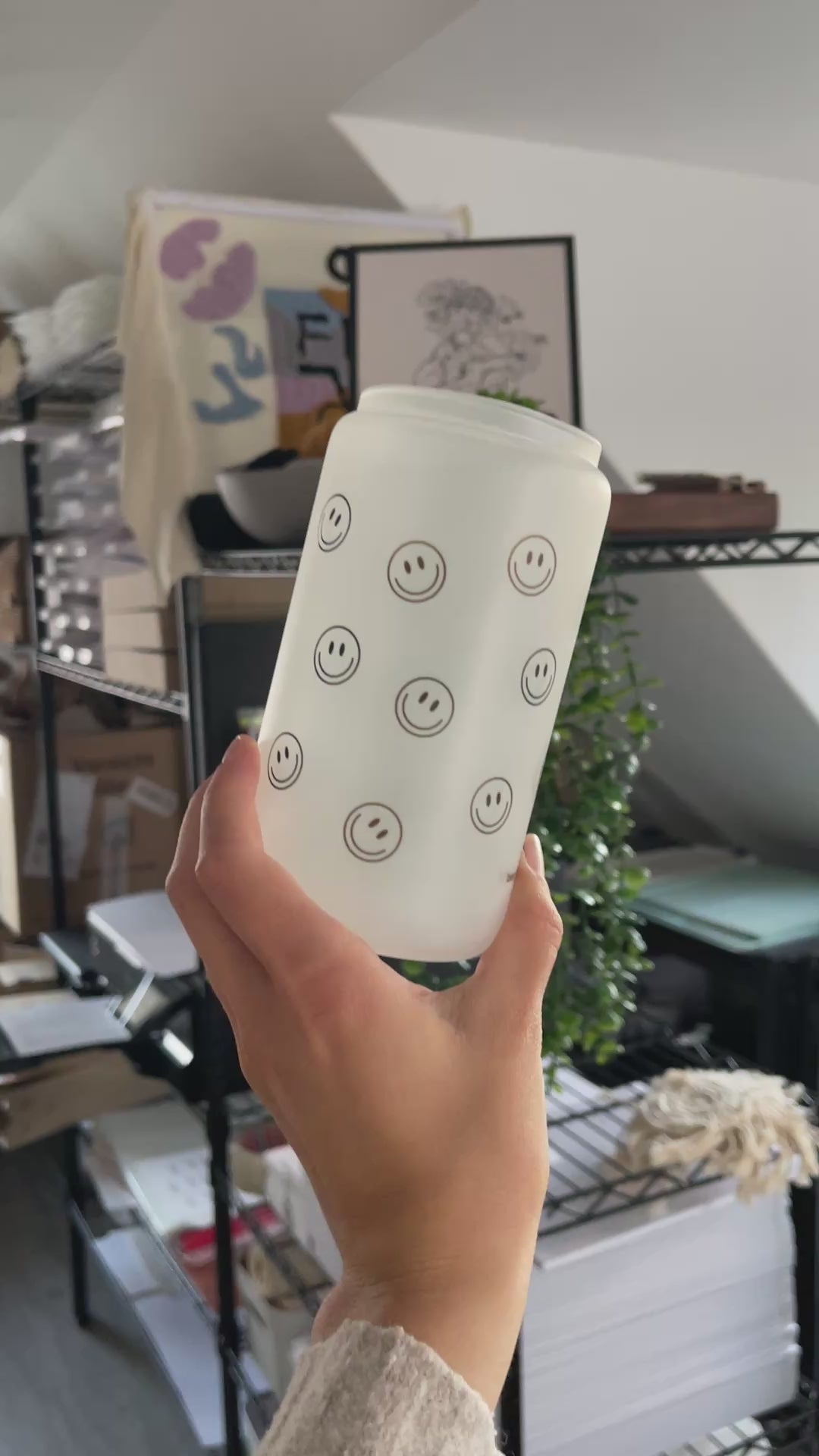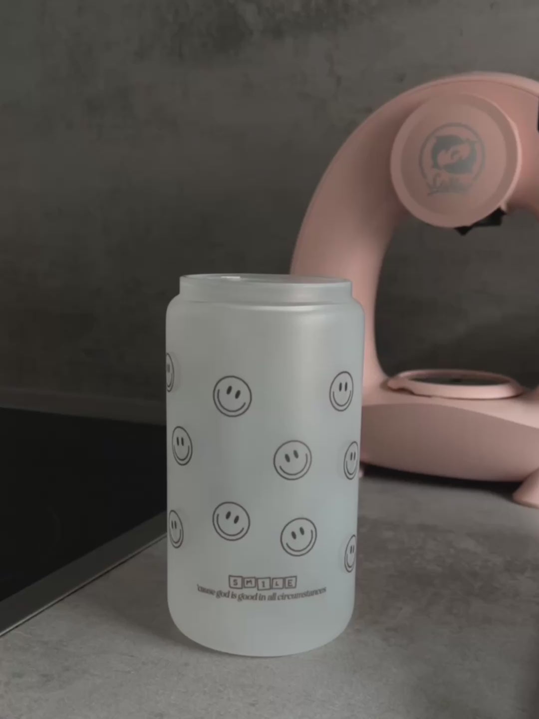 süßes Trinkglas, gefrostet, mit smileys drauf und dem Spruch: